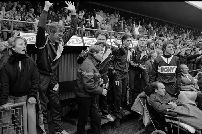 Daværende cheftræner Tom Køhlert ude på trænerbænken kort inden slutfløjt i '85.